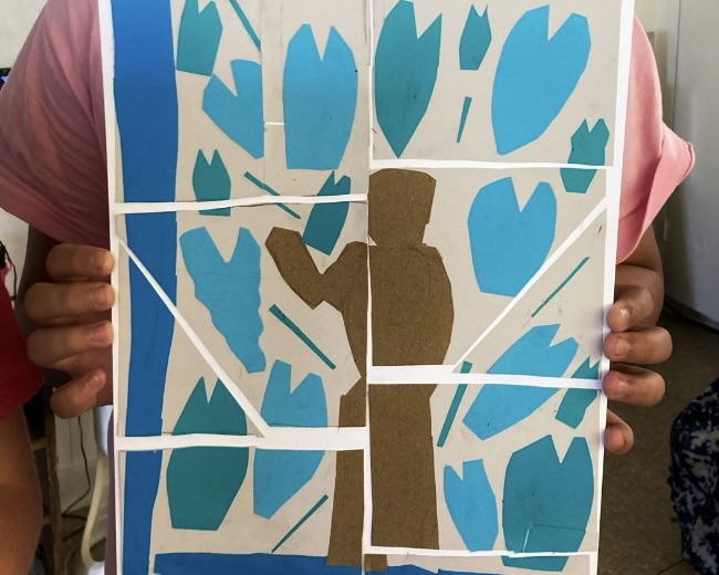 Inspired by Carol Yotsudaʻs ceramic mural, Pomaikaʻi Kākou I Ka ʻĀina, teaching artist, Tomoko Nakazato, guided Hōlualoa 3rd graders to create colorful collages about kalo.